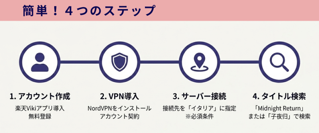 では、 「VPN」を使って、楽天Vikiで『子夜帰』を視聴する手順を見ていきましょう。